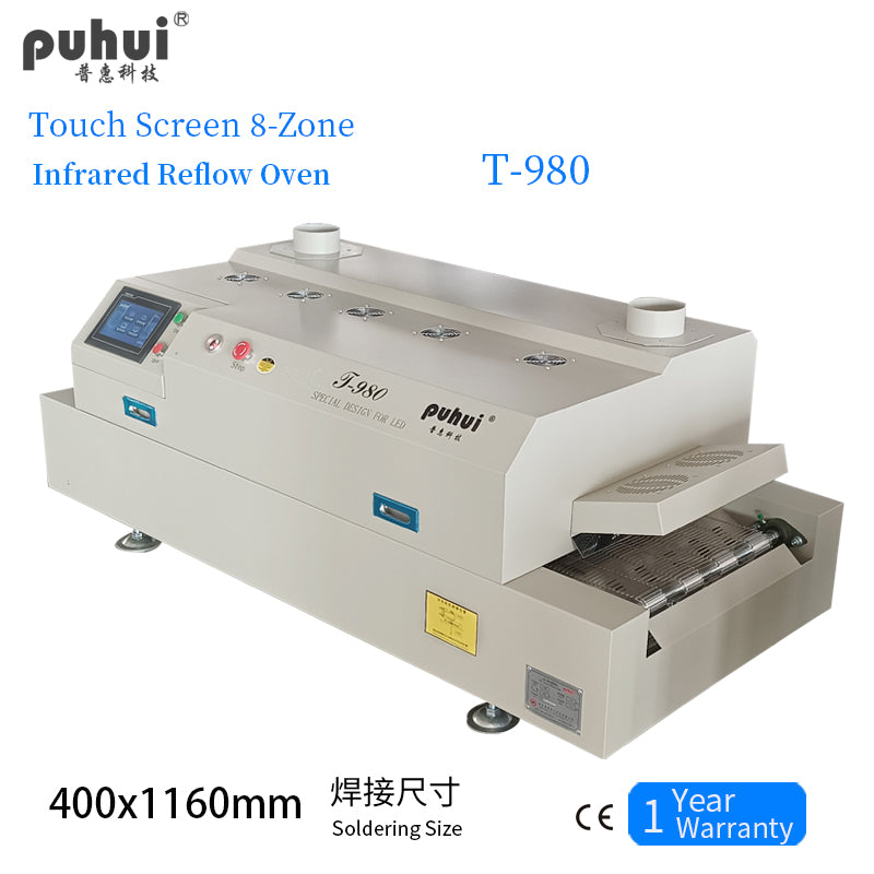 Puhui NEW touch screen T-980 model is 8 heating zone conveyor reflow oven with 400*1160mm soldering area. Refining multiple heating zones is better for precise soldering.